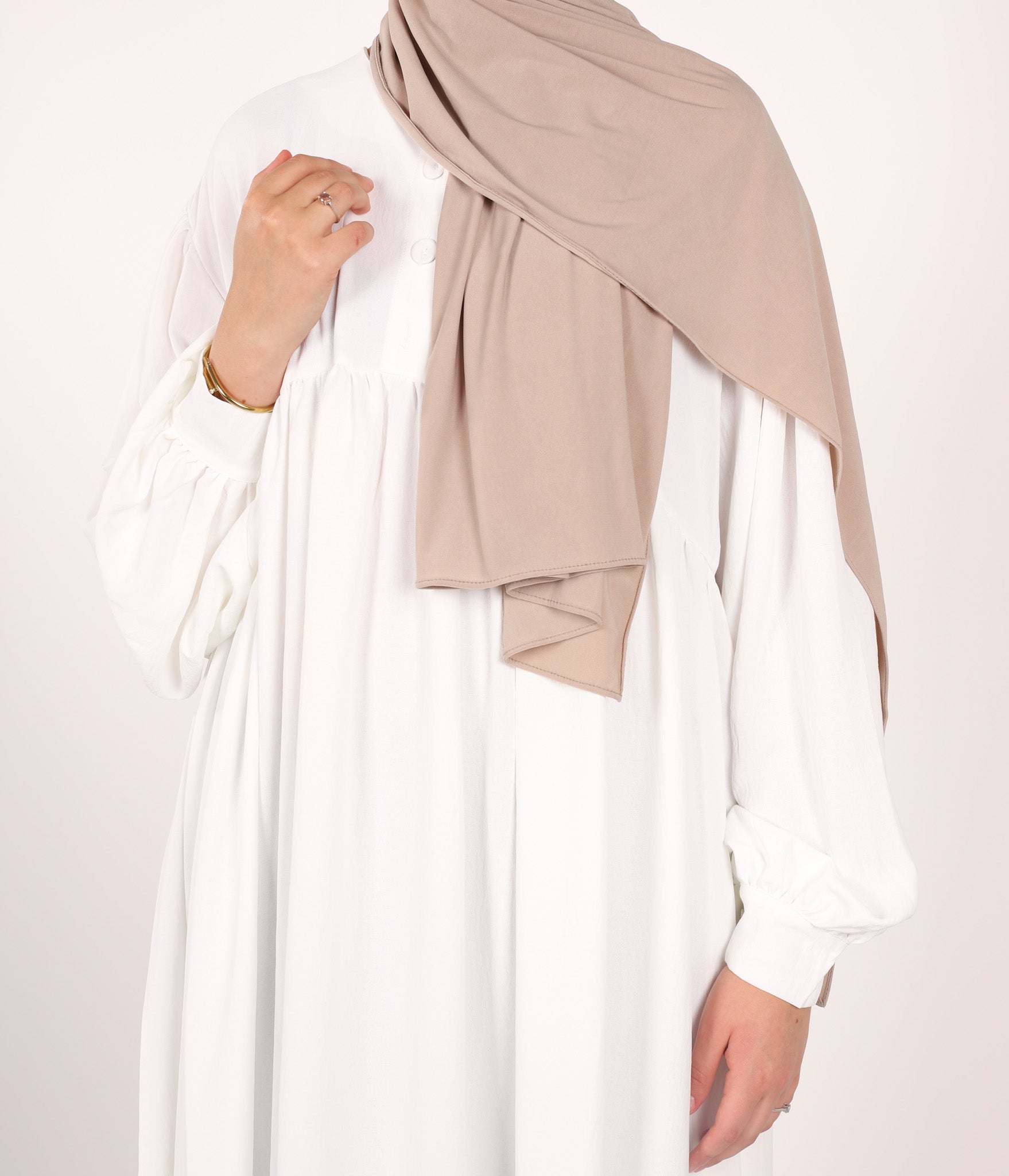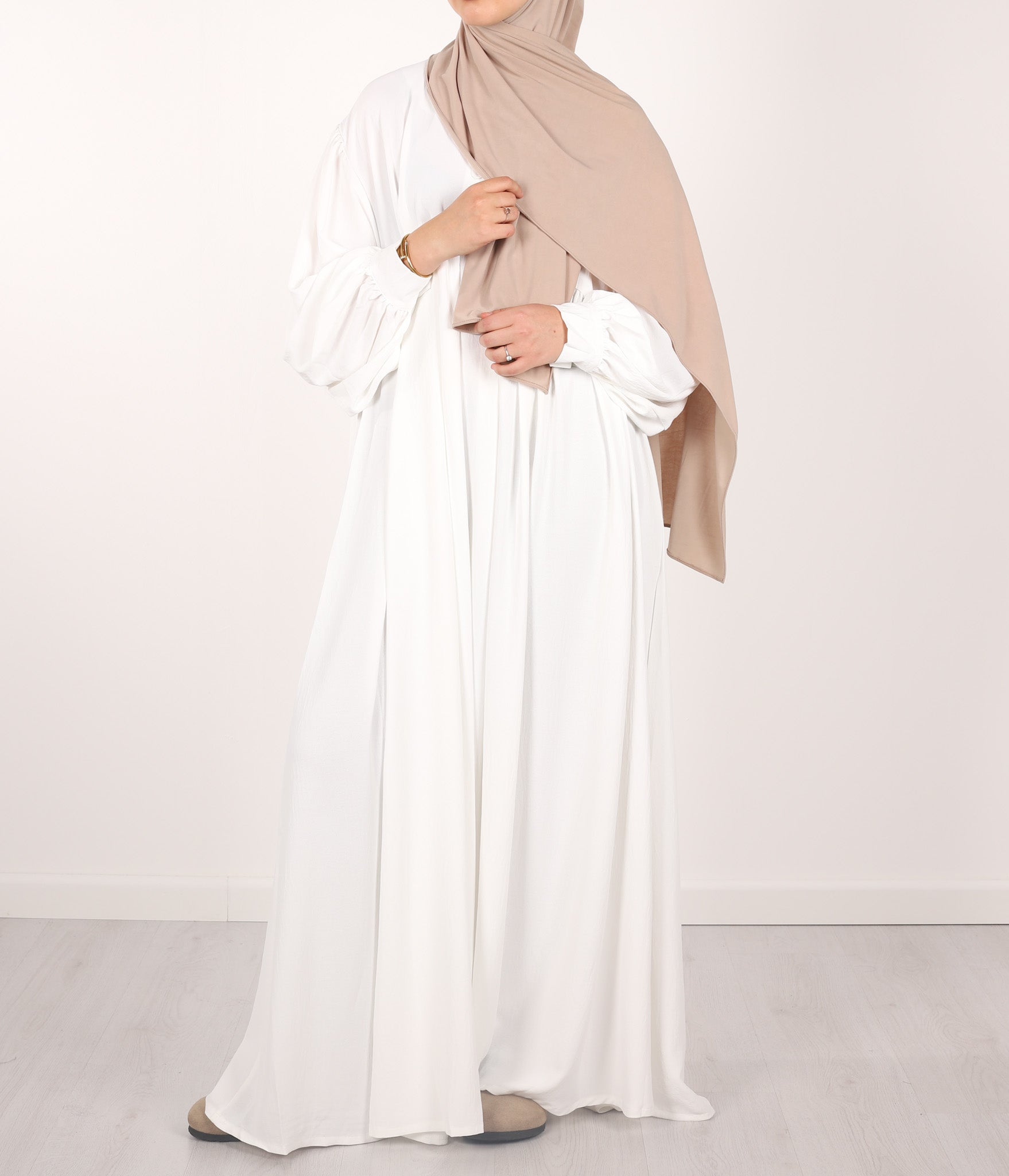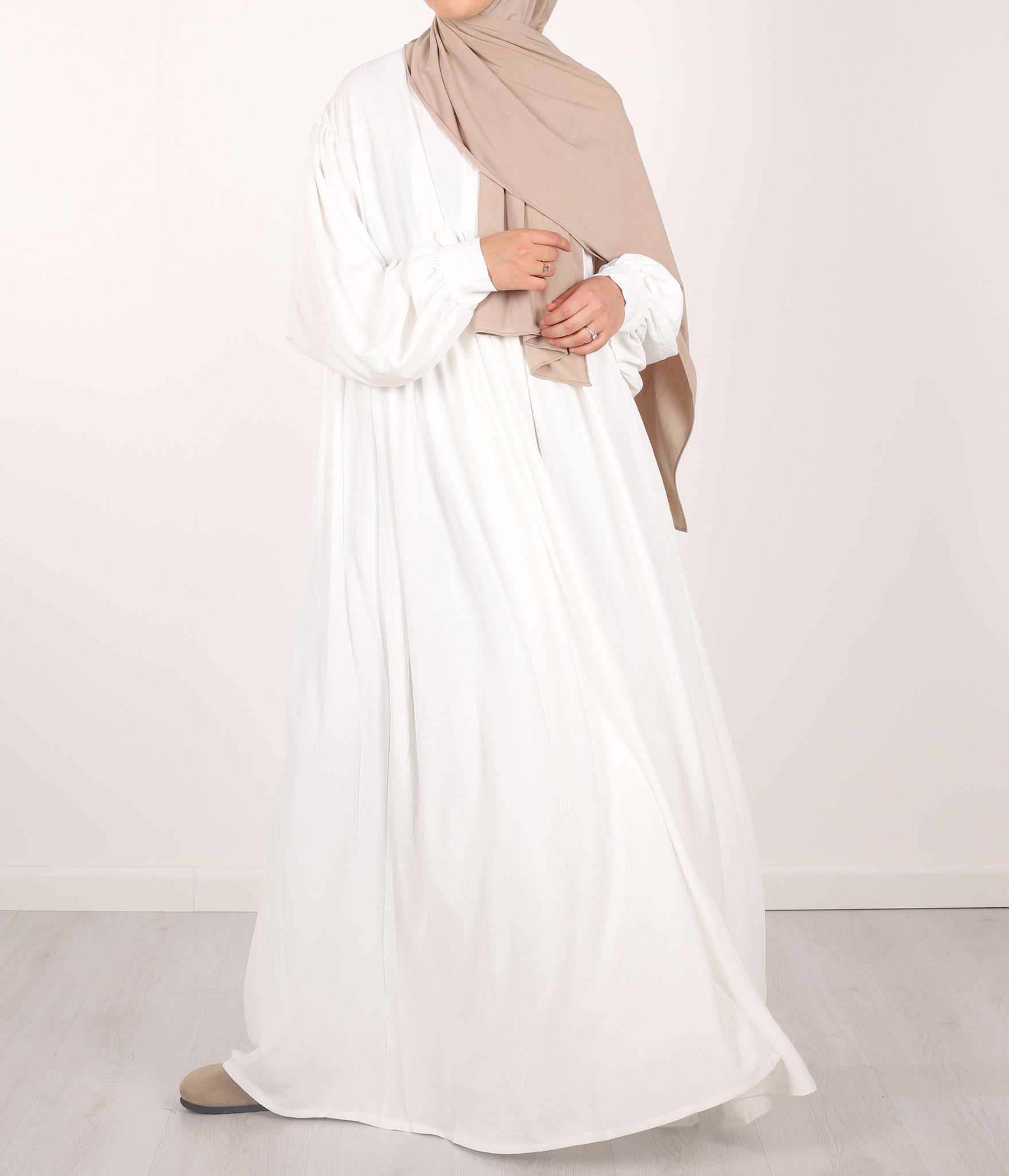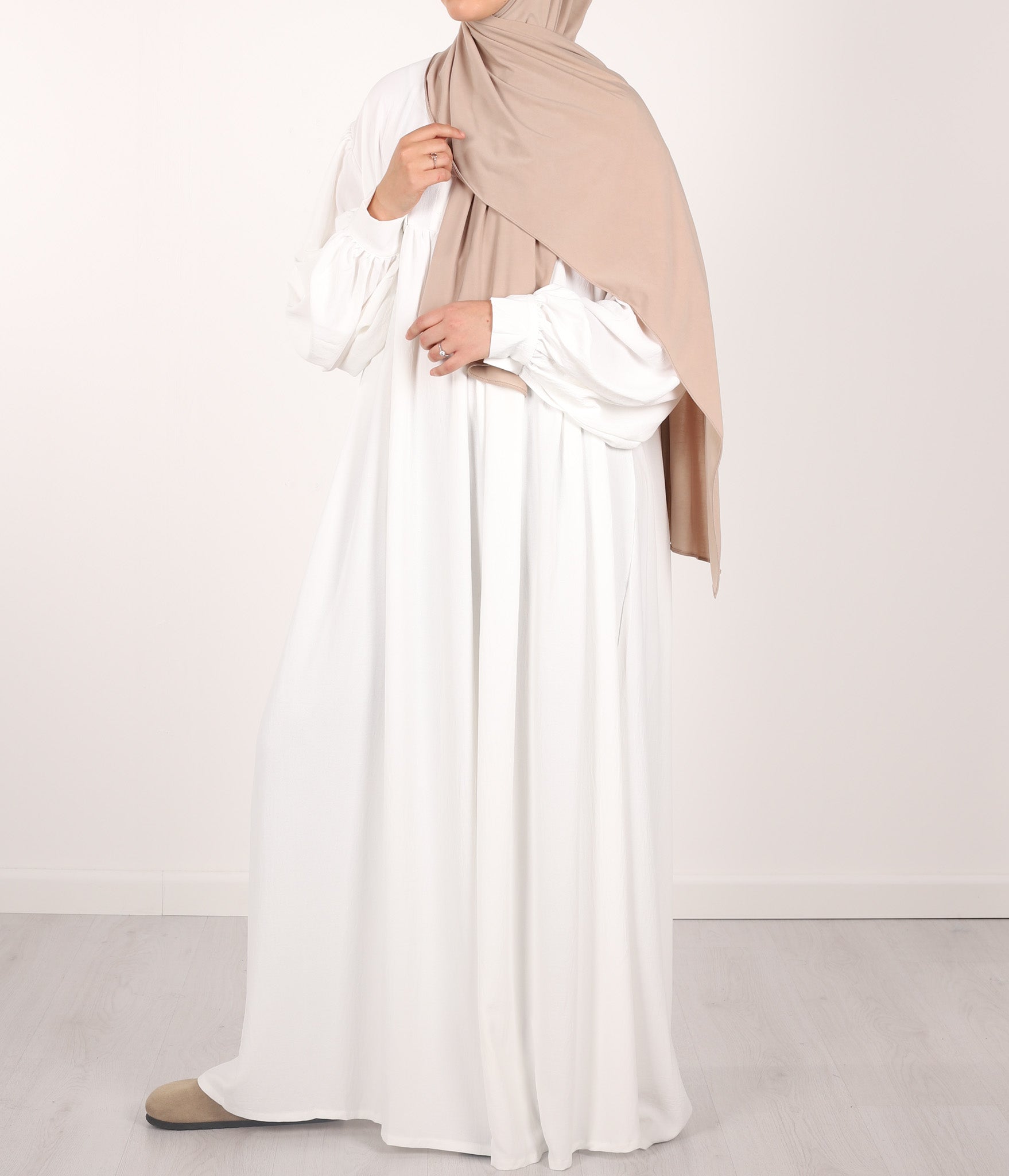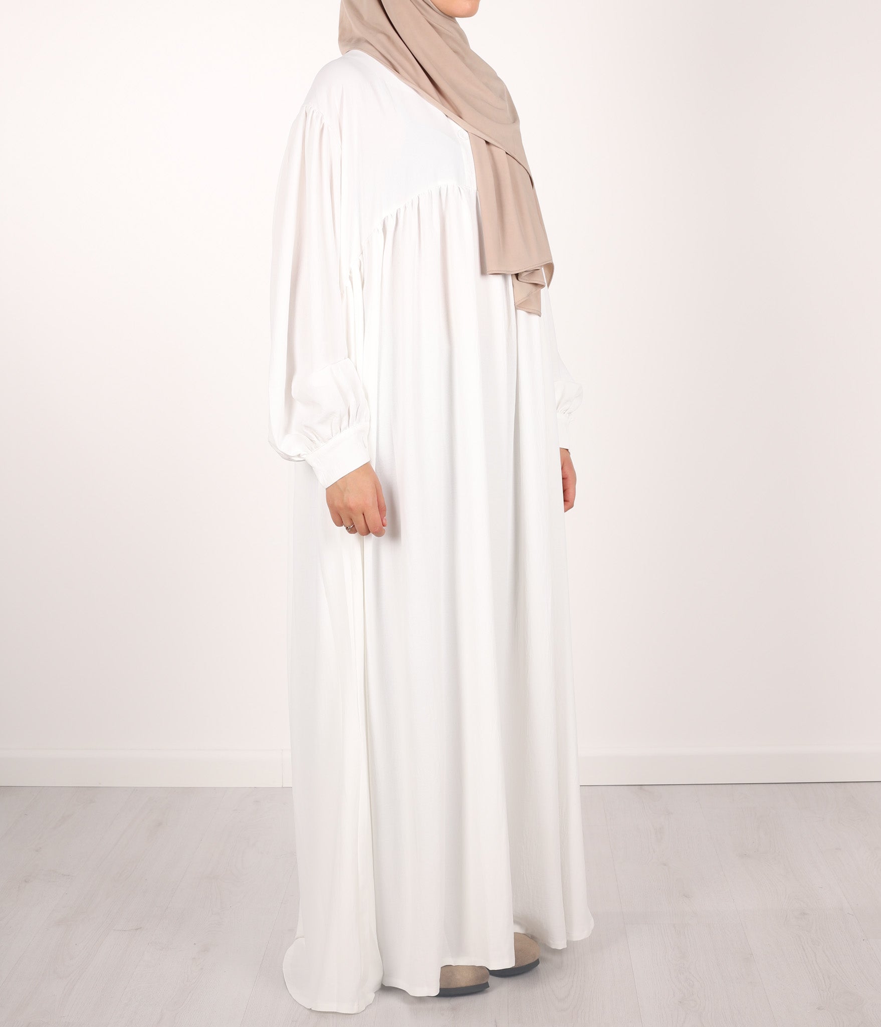 Ein eleganter (exzellent) bedeckender Jilbab mit feinen Falten auf der Brust und extra großen Puffärmeln. Durch den großzügig eingesetzten Stoff sind Körperpartien bei Bewegung nicht sichtbar. Einheitsgröße mit einer Länge von 145cm, kürzen möglich.