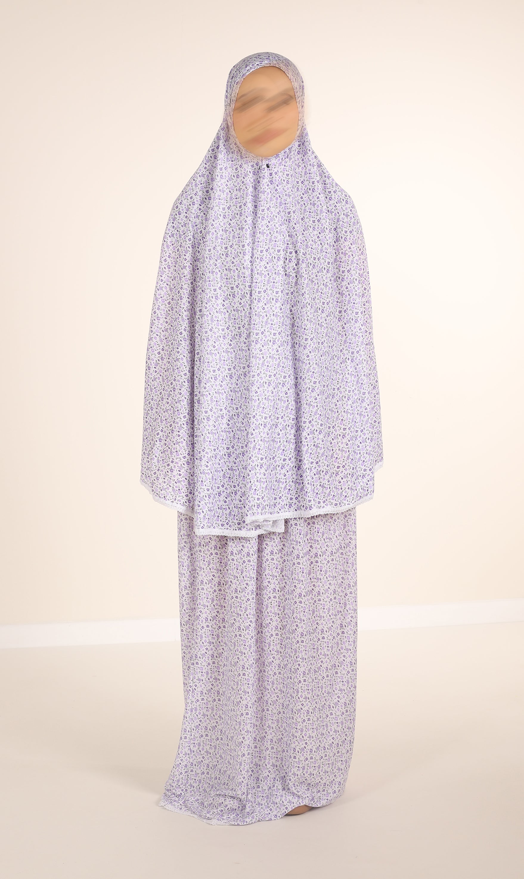 Ein zweiteiliges Gebetsset aus Baumwolle. Besteht aus einem Oberteil (Khimar) und einem Rock. Das Set besteht aus Baumwolle. Der Stoff ist mit einem floralen Print bedruckt. Einheitsgröße
