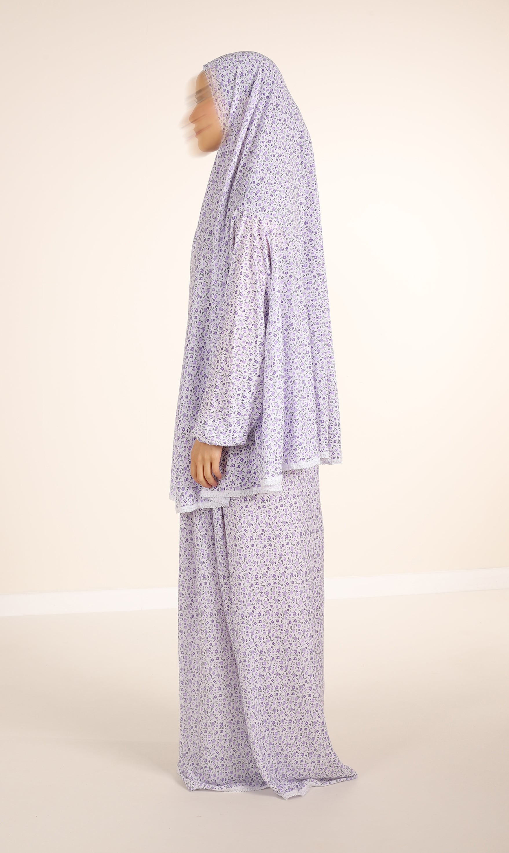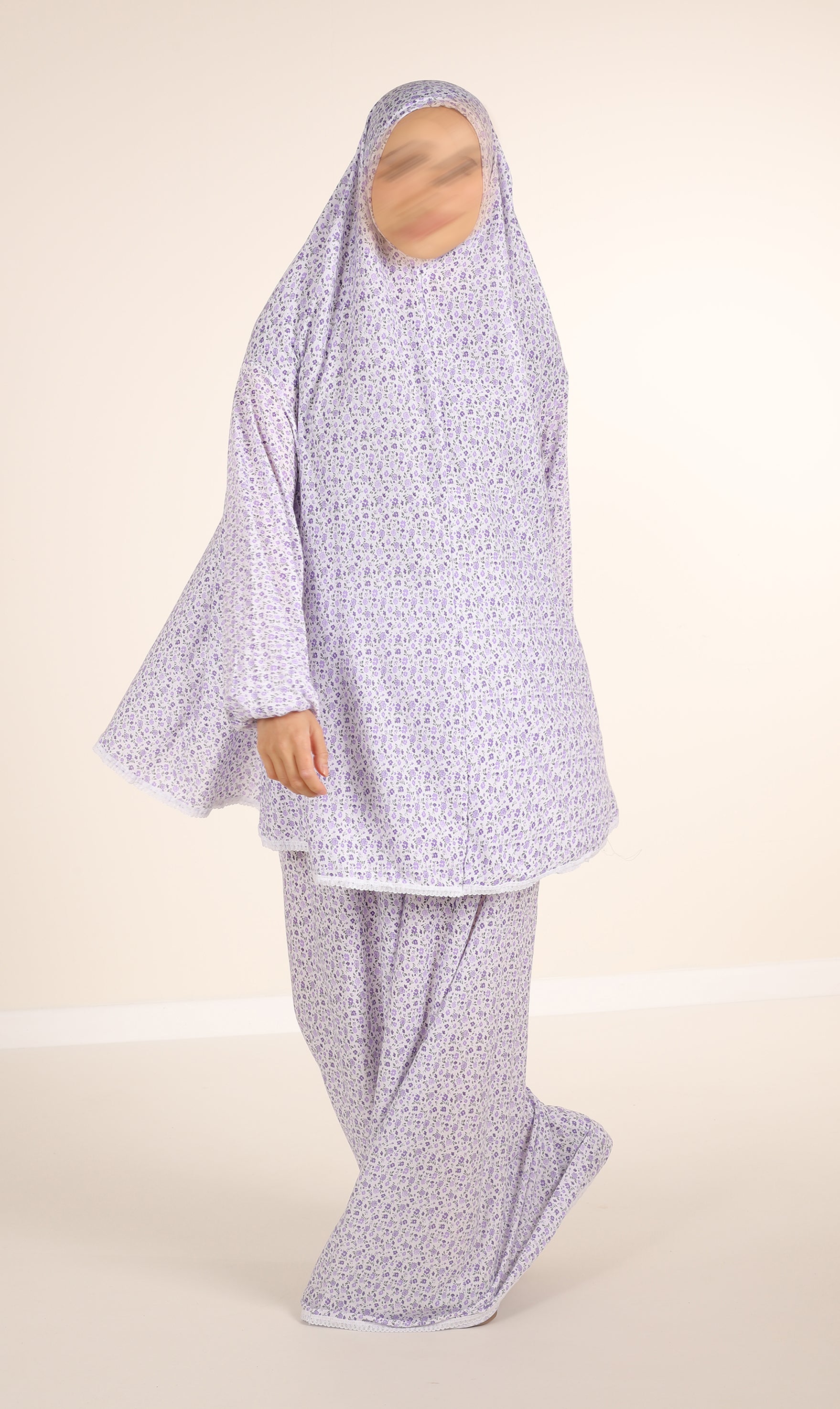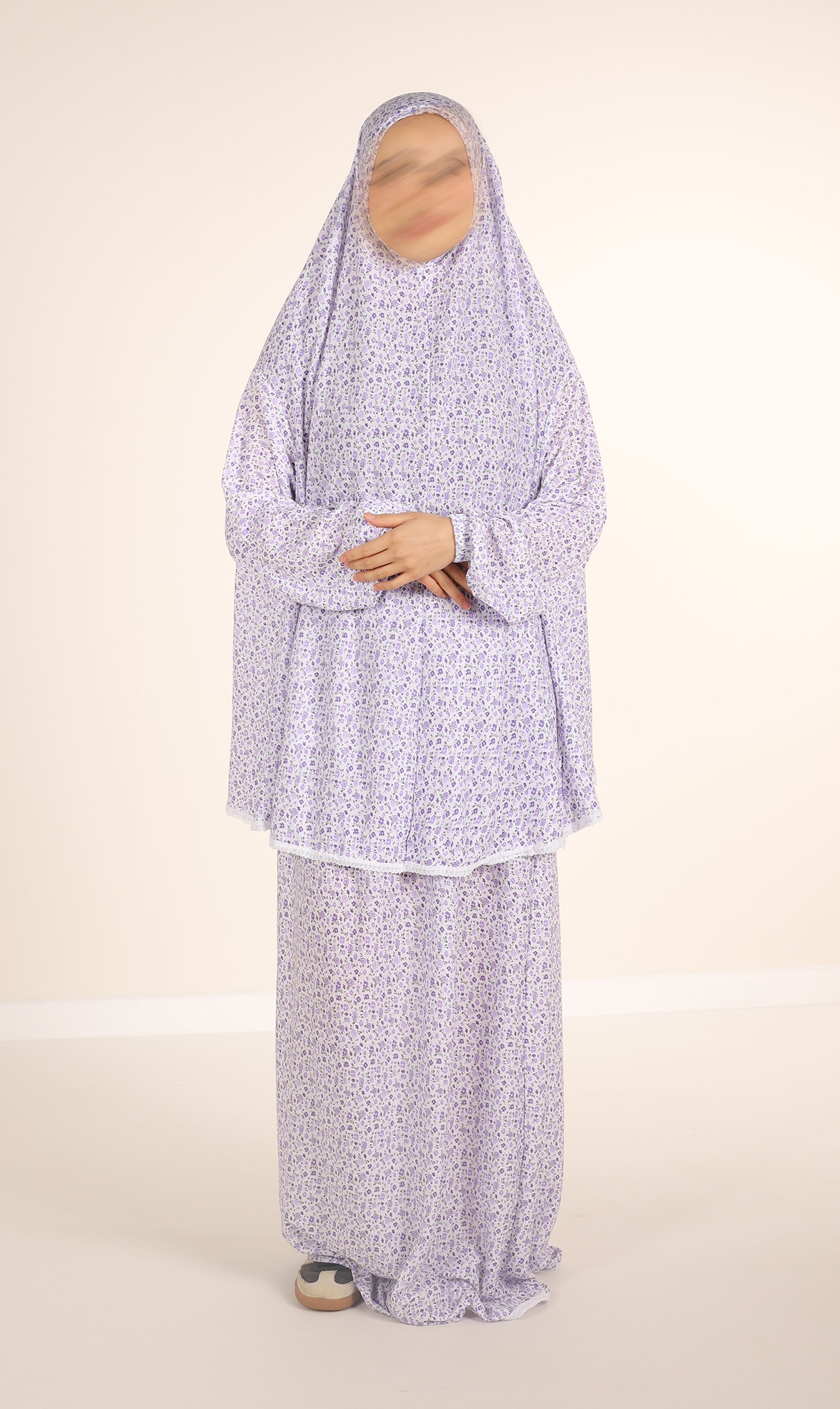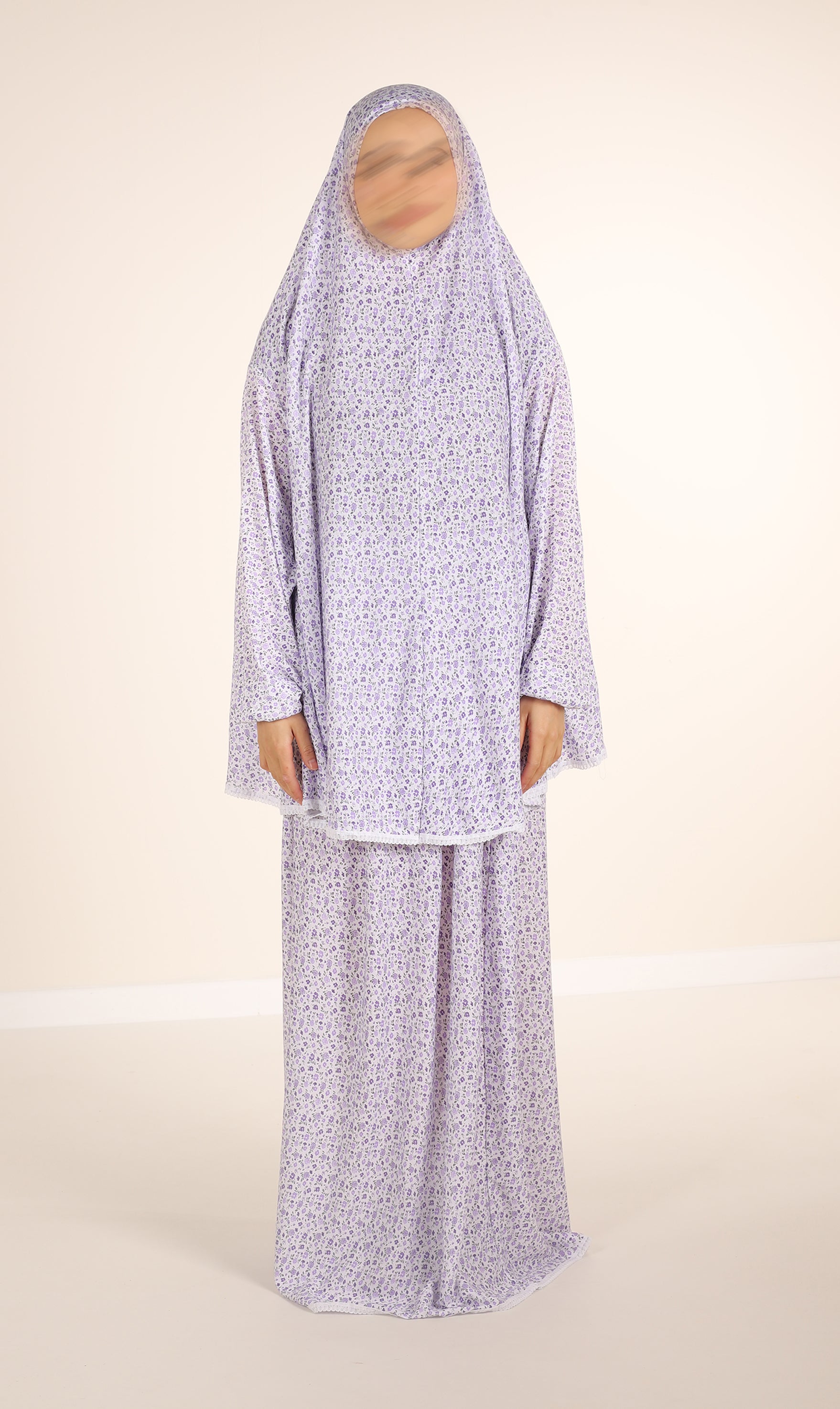 Ein zweiteiliges Gebetsset aus Baumwolle. Besteht aus einem Oberteil (Khimar) und einem Rock. Das Set besteht aus Baumwolle. Der Stoff ist mit einem floralen Print bedruckt. Einheitsgröße