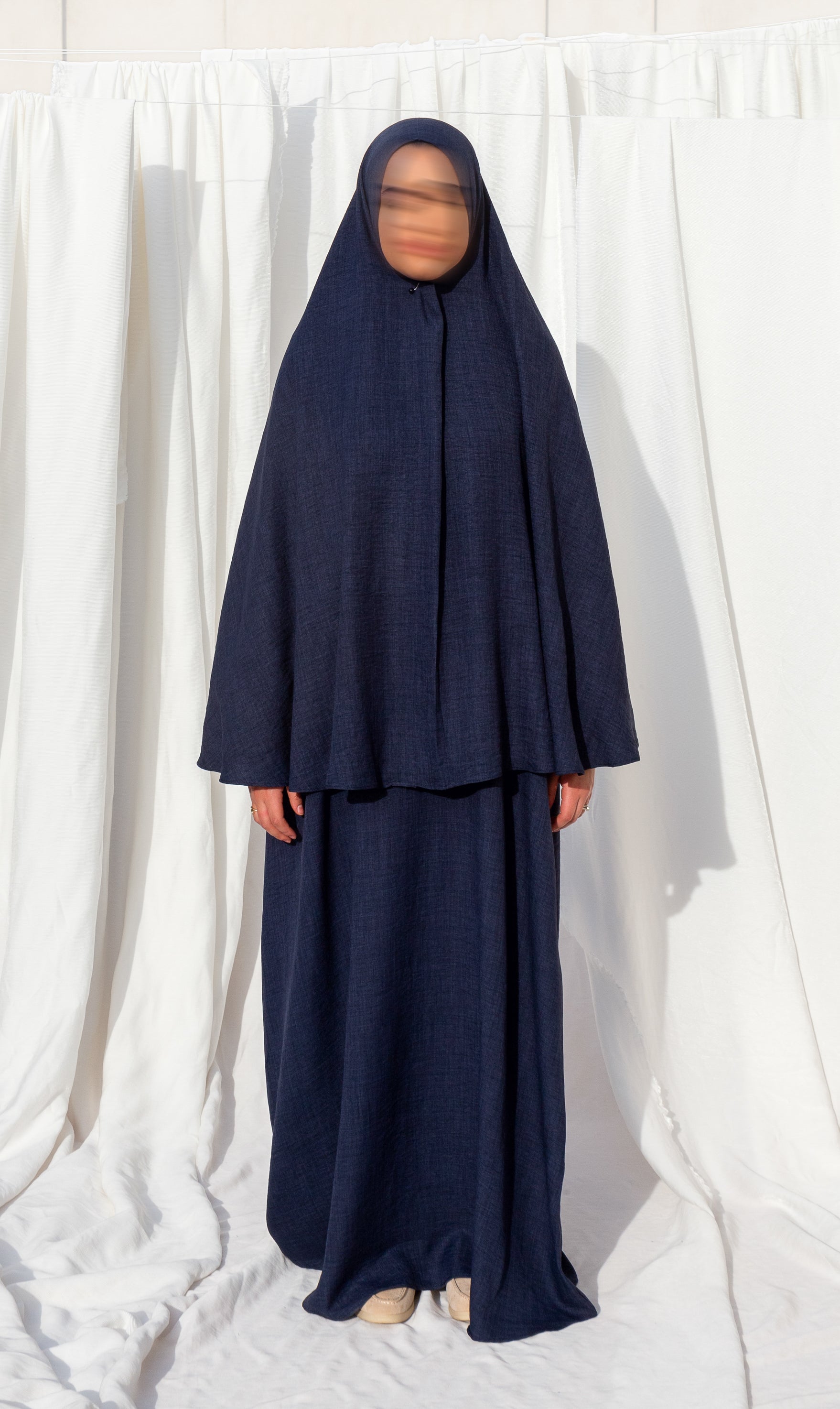 Ein eleganter Hüft-Khimar aus leinenähnlichem Stoff. Er ist leicht, bequem und angenehm dehnbar. Der Khimar lässt sich perfekt mit der separat erhältlichen 3baya Abaya kombinieren. Er ist ca. 110 cm lang und aus blickdichtem Stoff.
