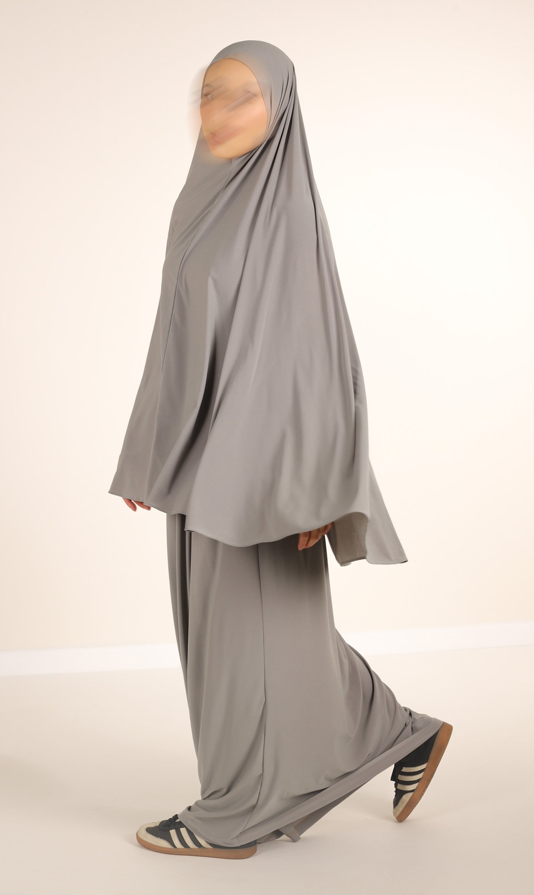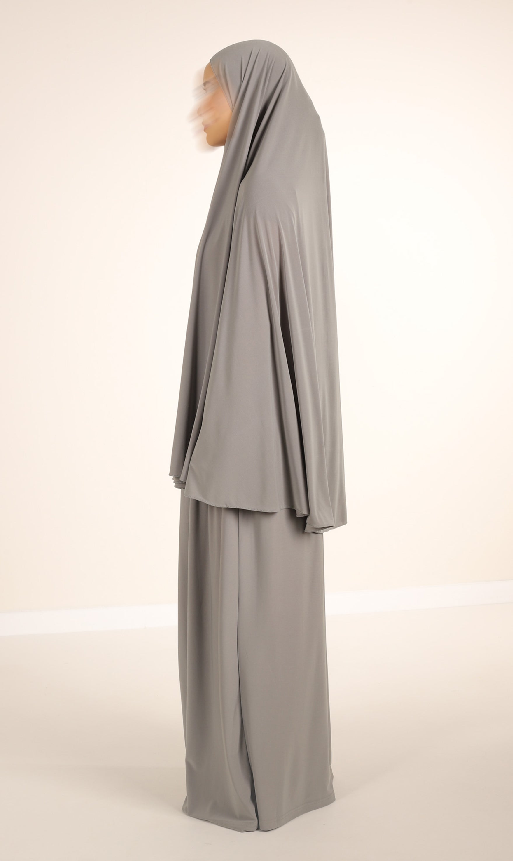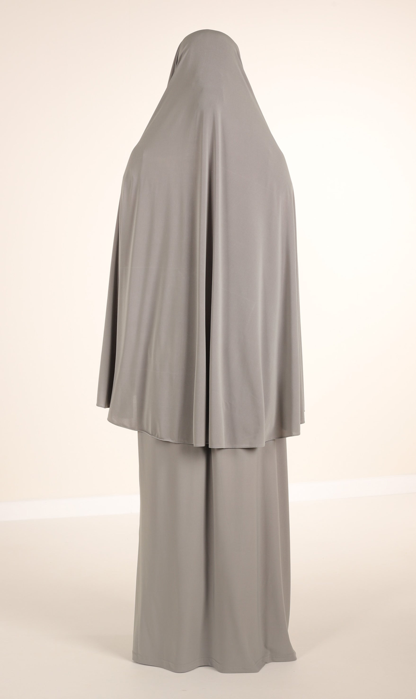 Ein Basic-Set bestehend aus einem klassischen Hüft-Khimar und einem passenden Rock. Beide sind aus hochwertigem Jersey gefertigt. Die Farbe ist Pistaziengrau.