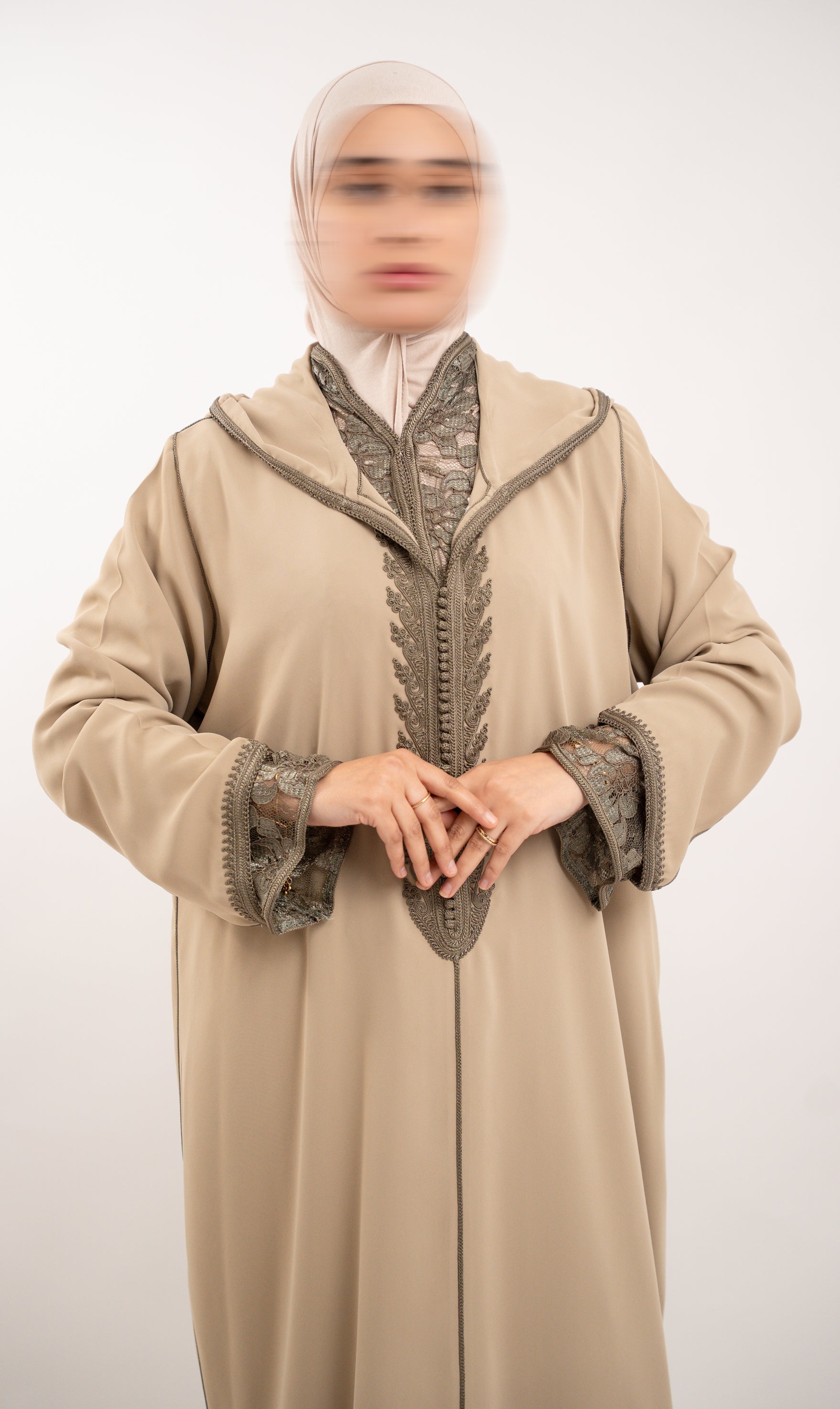 Dieser zweiteiliges Damen-Jelleba mit Kaftan Es handelt sich um eine original marokkanische Kreation mit anmutiger und eleganter Optik. Hergestellt aus hochwertigem Stoff und entworfen für bequemen und stilvollen Tragekomfort, sowohl für besondere Anlässe als auch für festliche Gelegenheiten.